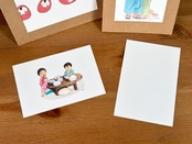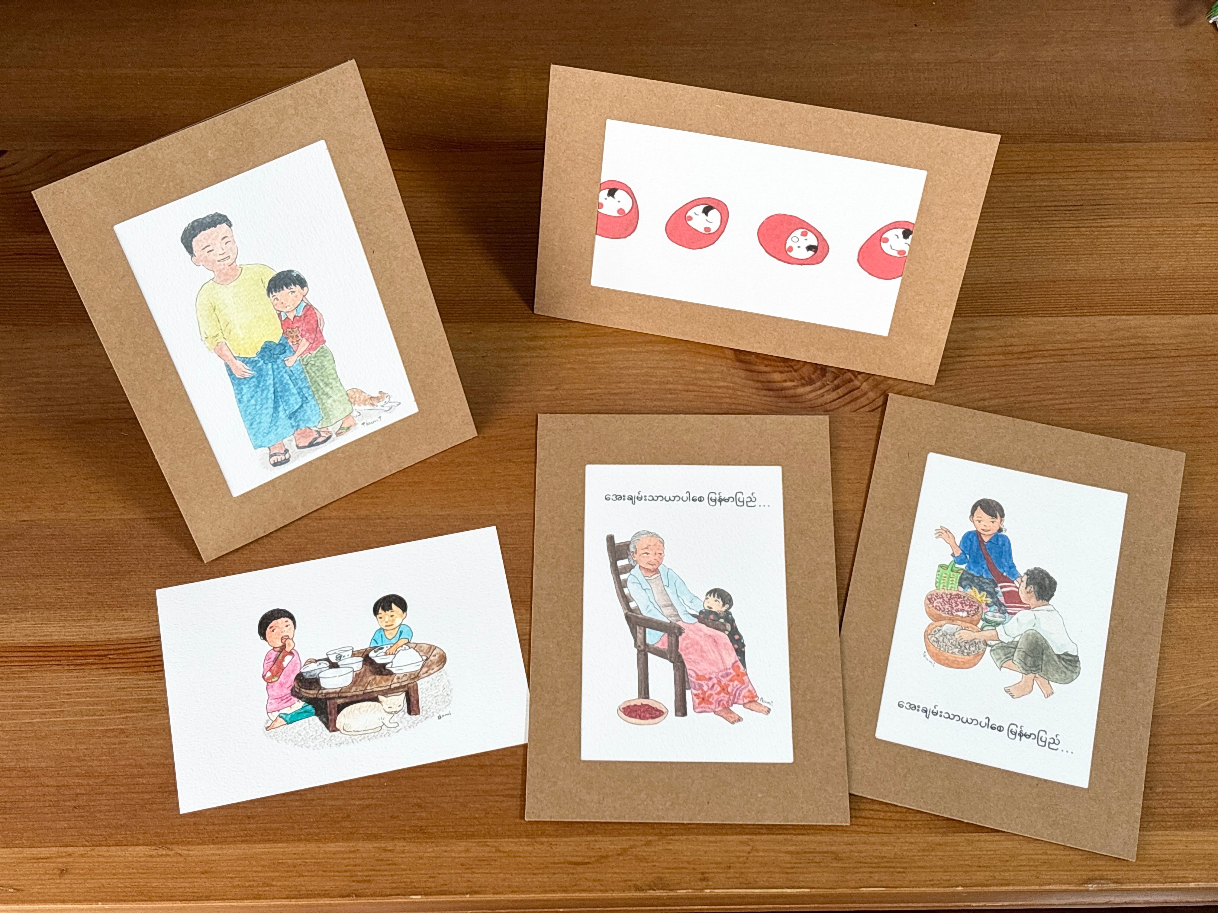 イラストは、ミャンマー在住経験のあるイラストレーター ikumi さんによる手描きの水彩画を、風合い豊かなエンボス紙に高品質プリントしたものです。