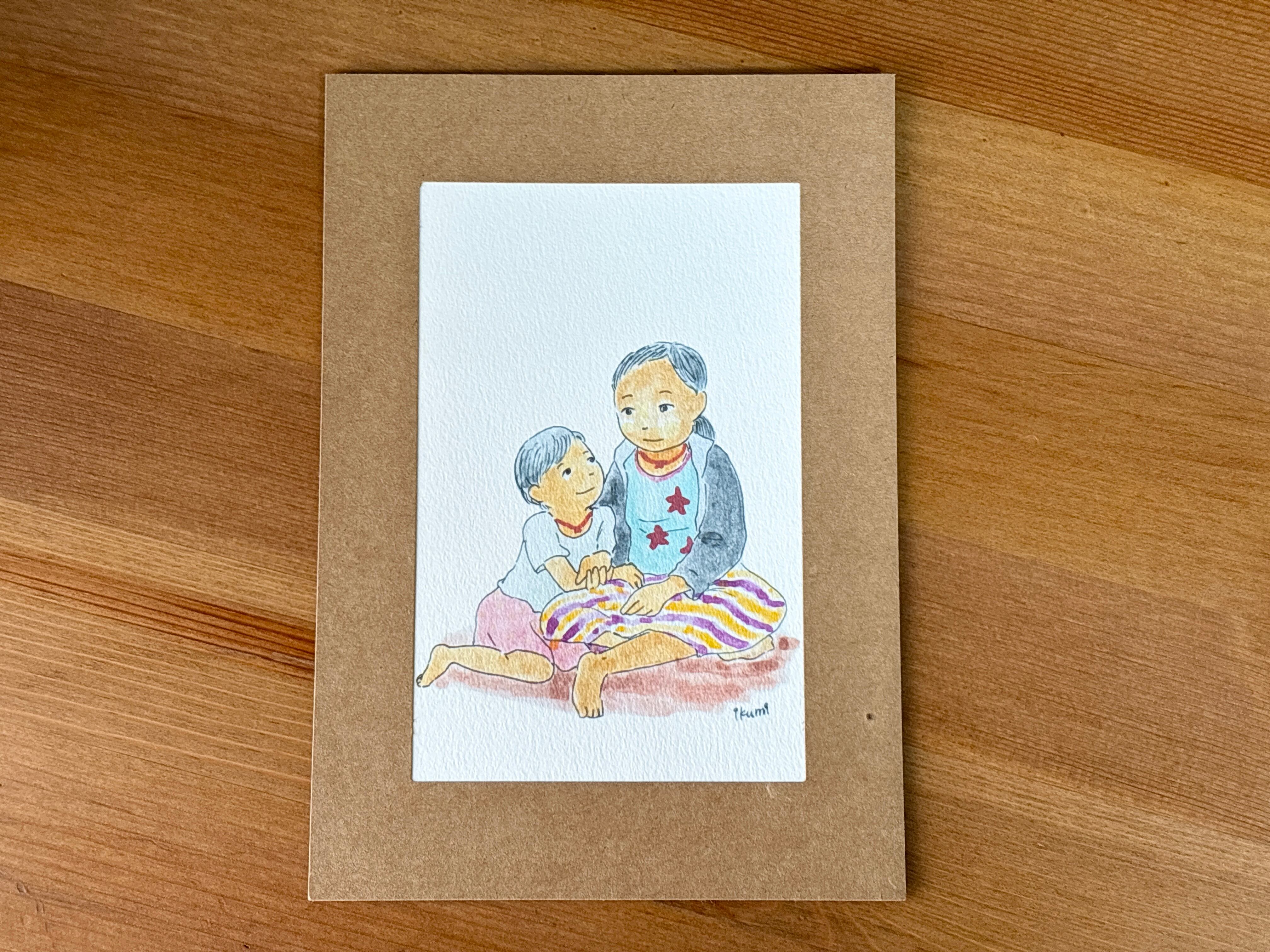 ミャンマー 水彩プリント 額入りイラスト【姉妹】 TZK0021