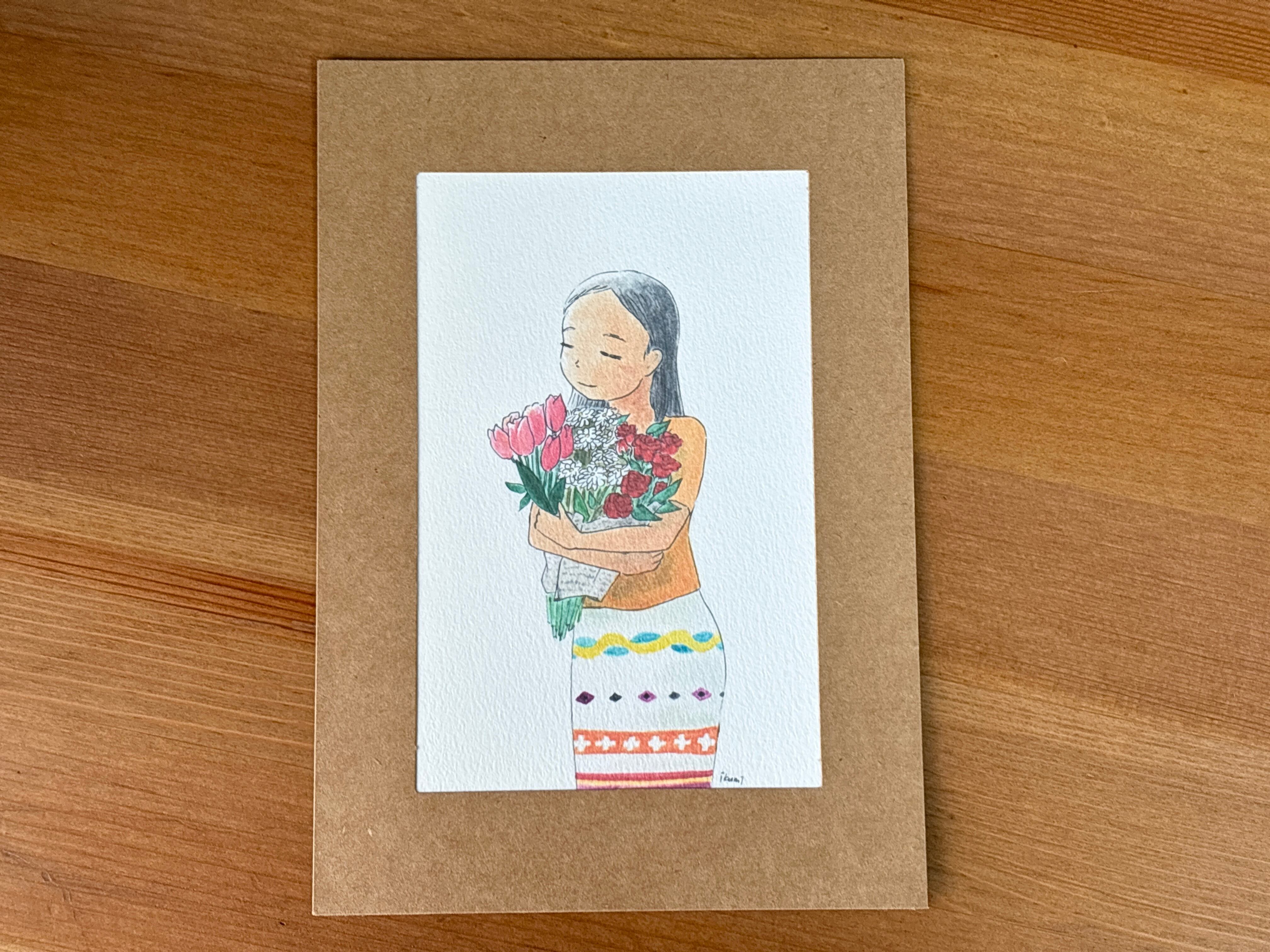ミャンマー 水彩プリント 額入りイラスト【花束】 TZK0027