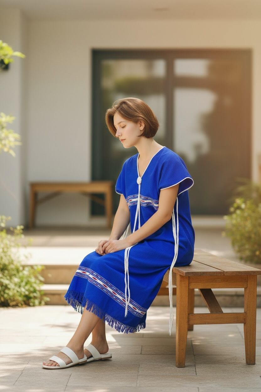 一枚の布の中央に穴を開けて頭を通し、両脇を縫い合わせたシンプルな構造。ゆったりとしたシルエットで、体型を選ばずリラックスしてご着用いただけます。無駄のないつくりが、布本来の美しさと手仕事ならではの温もりを引き立てます。