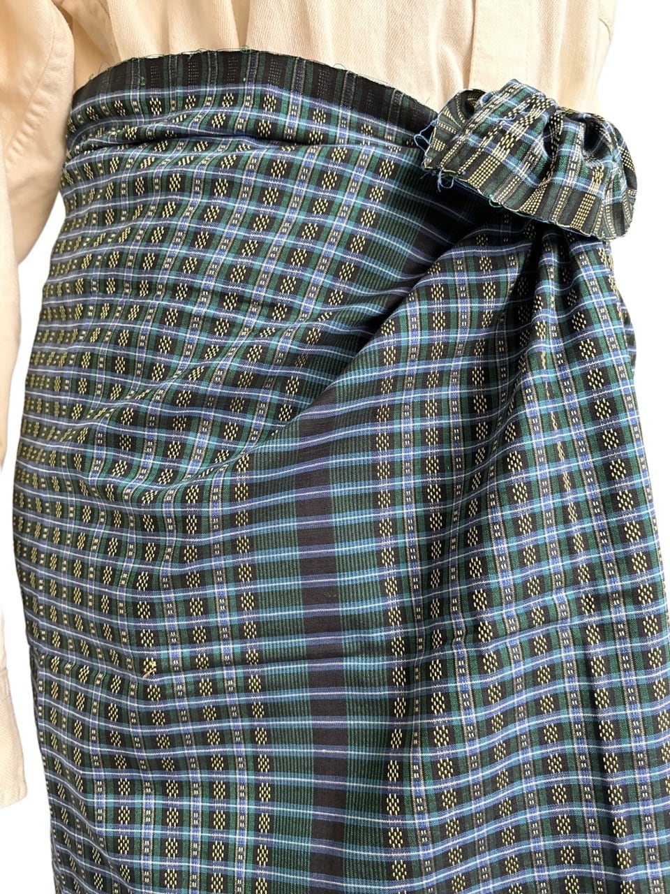 ロンジーは筒状に縫い合わせた作りのため、ウエストは自在に調整可能。丈も腰のところで捲り上げるようにして調整します。